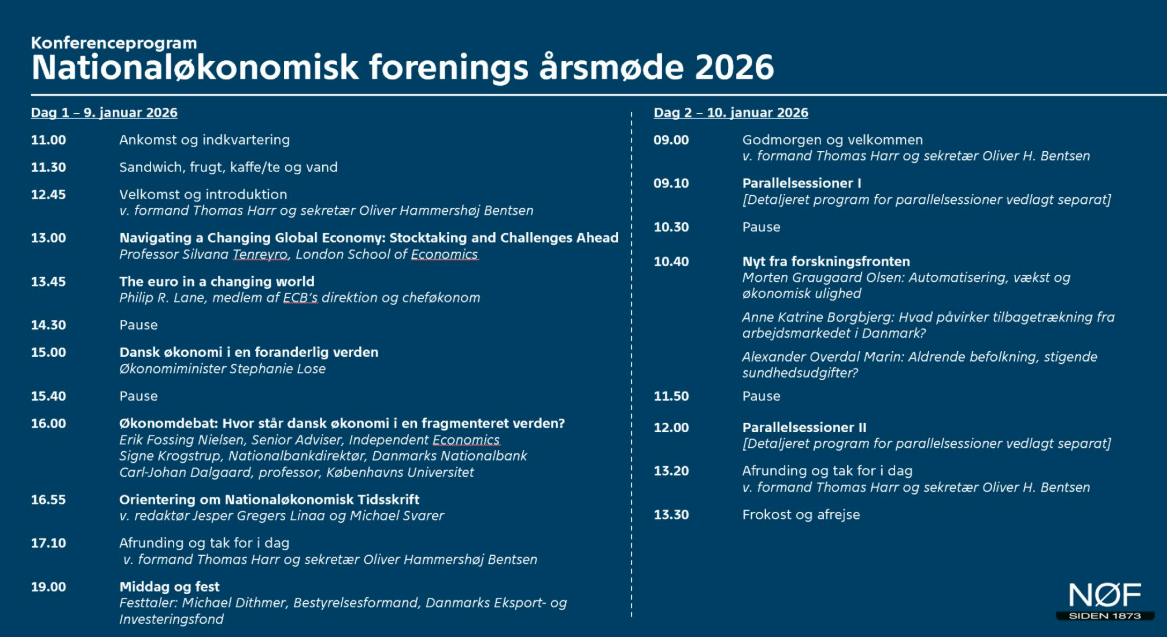 Fredag d. 9. til lørdag d. 10. januar afholder Nationaløkonomisk Forening årsmøde på Hotel Koldingfjord. Det overordnede tema for årsmødet er